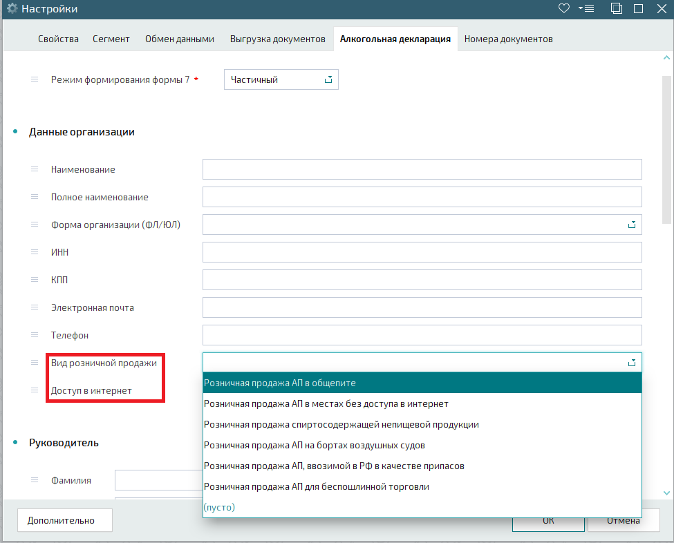 В карточке «Настройки» на закладке "Алкогольная декларация" в блок "Данные организации" добавили 2 поля: 1. Вид розничной продажи (ВидПрод). Значение от 1 до 6, выпадающий список с выбором нужного значения. 2. Отсутствие доступа к интернет (ОтсутИнет). Допустимые значения Да/Нет.