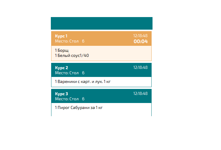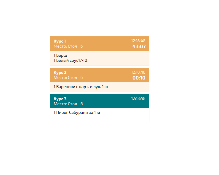 При нажатии на блюда с курсом, отличным от первого, происходит изменение со статуса «Ожидание приготовления» на статус «Пора готовить» и начинается отсчет времени.