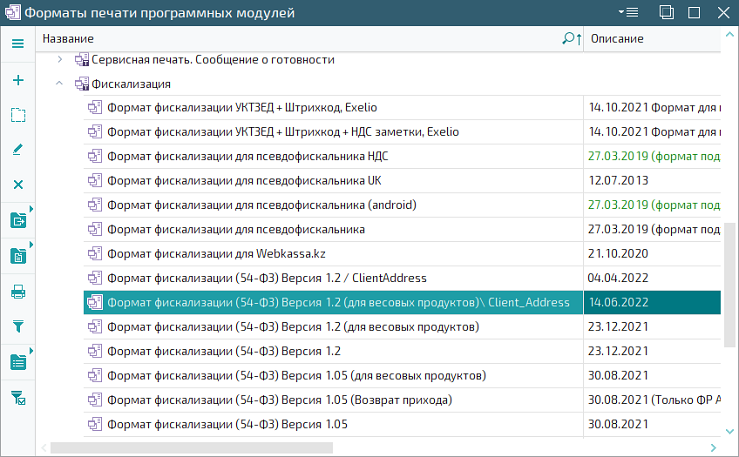 Форматы печати программных модулей добавлен Формат фискализации (54-ФЗ) Версия 1.2 (для весовых продуктов)\ Client_Address. Он применяется при фискализации продаж весовых продуктов.
