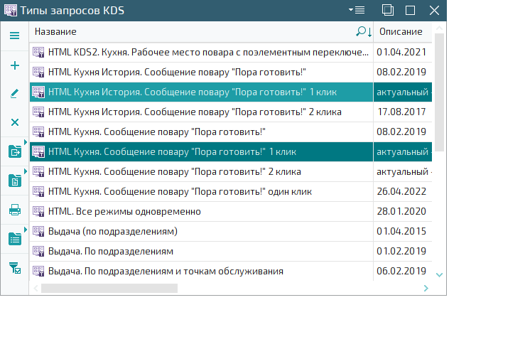 В справочник добавлены новые системные типы запросов KDS HTML Кухня. Сообщение повару "Пора готовить!" 1 клик и HTML Кухня История. Сообщение повару "Пора готовить!" 1 клик.