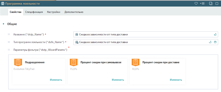 Проценты скидки для доставки курьером и для самовывоза указываются в параметрах Программы Лояльности.